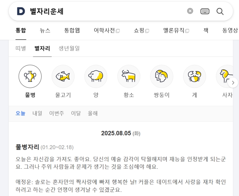 2. 동양의 띠별 운세가 익숙하지 않다면 서양의 별자리 운세를 보는 것도 좋은 방법이에요. 물병자리, 물고기자리 등 자신의 별자리를 선택하면 예술적 감각이나 재능에 대한 이야기와 함께 애정운에 대한 조언도 함께 얻을 수 있습니다.