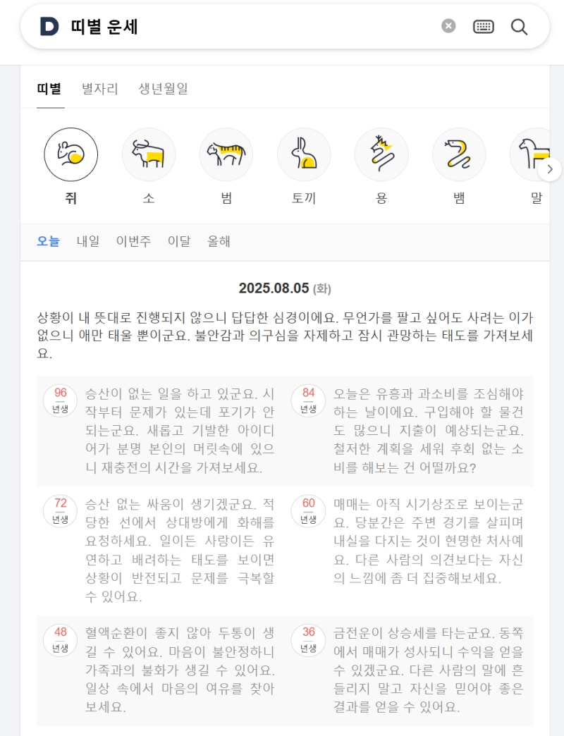 1. 다음에서 '띠별 운세'를 찾아보면 오늘의 총운과 함께 태어난 해에 따른 세부적인 조언을 얻을 수 있어요. 예를 들어 쥐띠를 선택하면 96년생, 84년생 등 각 연도에 맞는 다른 풀이를 보여주어 나에게 더 맞는 이야기를 참고할 수 있습니다.