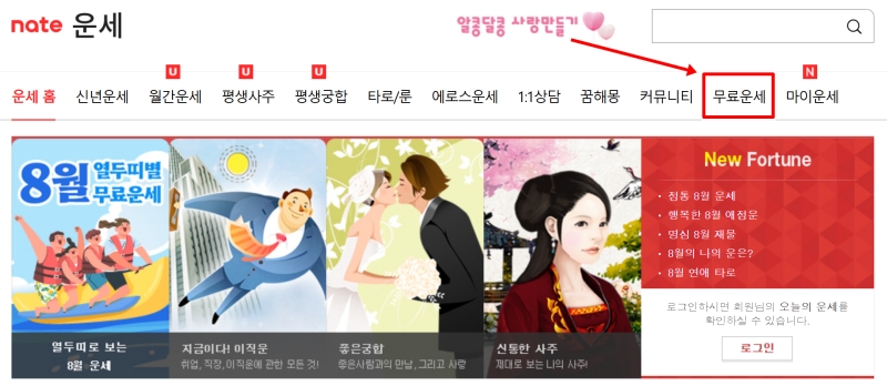5. 네이트 운세 홈페이지에 접속하면 신년운세, 평생운세 등 여러 메뉴가 보이지만, 우리는 가볍게 즐길 수 있는 '무료운세' 코너를 통해 오늘의 기운을 부담 없이 확인해 볼 수 있습니다.