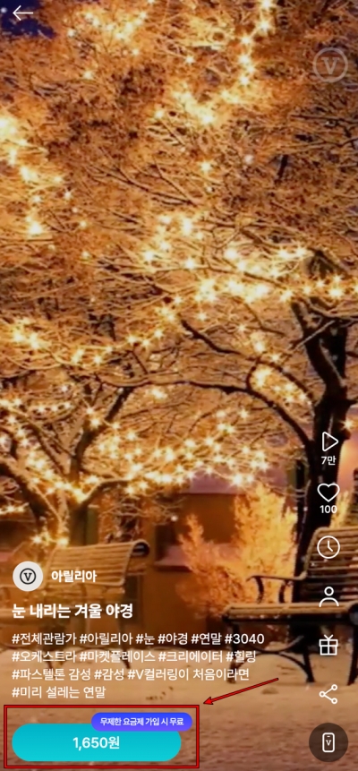 마음에 드는 영상을 하나 선택해서 들어가 봤어요. 예시로 고른 '눈 내리는 겨울 야경' 영상 아래를 보니 '1,650원'이라는 가격표와 함께 '무제한 요금제 가입 시 무료'라는 안내가 있었어요. 이처럼 특정 요금제에 가입하면 많은 영상을 무료로 이용할 수 있으니, 본인의 통신사 혜택을 잘 확인해보는 것이 중요해요.