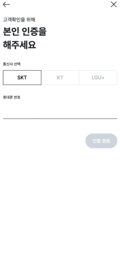 휴대폰 번호로 시작하기를 선택하면, 본인 확인을 위한 인증 절차를 거치게 돼요. 내가 사용하고 있는 통신사를 선택하고, 아래 빈칸에 내 휴대폰 번호를 정확하게 입력한 뒤 '인증 완료'를 누르면 간단하게 본인 확인이 마무리됩니다.