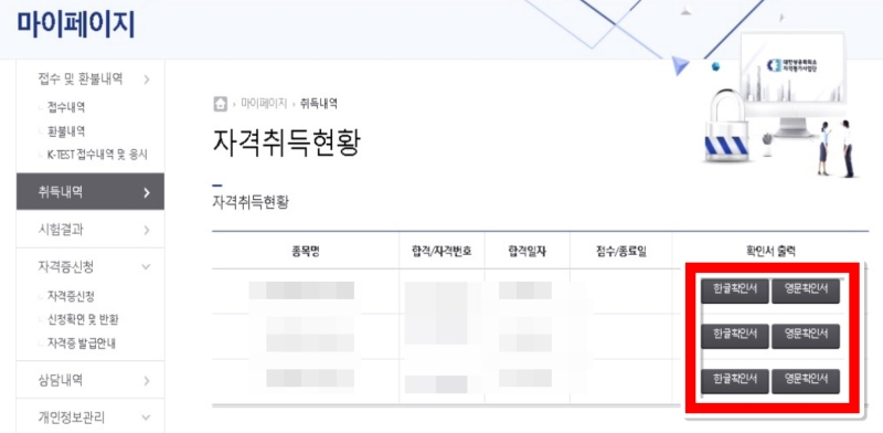 로그인을 마치면 마이페이지로 이동하게 되는데, 여기서 나의 모든 자격 정보를 확인할 수 있어요. 화면 왼쪽에 있는 여러 메뉴 중에서 '취득내역'을 선택하면, 내가 합격했던 자격증 목록이 쭉 나타납니다. 각 자격증 항목 오른쪽에는 '한글확인서'와 '영문확인서'를 출력할 수 있는 부분이 마련되어 있어요.
