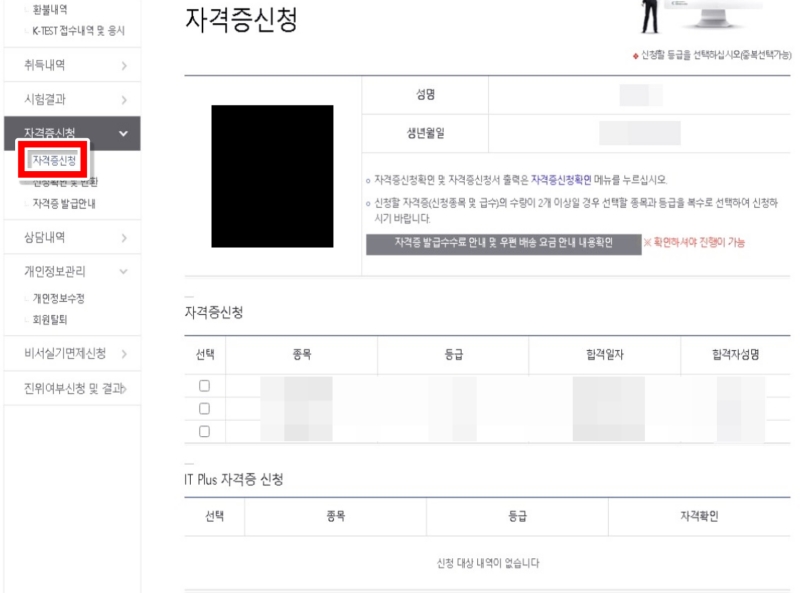 실물 자격증을 신청하려면 마이페이지의 '자격증신청' 메뉴로 들어가면 돼요. 이곳에서 내가 취득한 자격증 목록을 다시 한번 확인할 수 있는데, 재발급을 원하는 자격증을 선택하고 안내에 따라 절차를 진행하면 새로운 자격증을 신청할 수 있습니다.