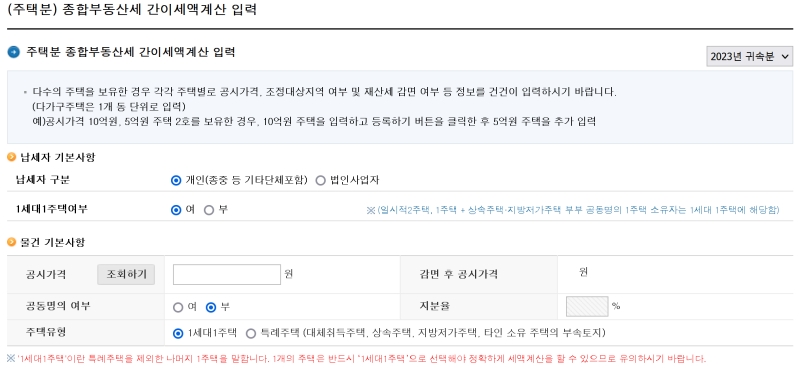 본격적으로 내 부동산 정보를 입력하는 화면이 나왔어요. 납세자 구분(개인/법인), 1세대 1주택 여부, 공동명의 여부 등 본인에게 해당하는 사항을 꼼꼼하게 선택하고, 가장 중요한 '공시가격'을 정확하게 입력해 주세요. 이 정보를 바탕으로 세금이 계산되니 틀리지 않게 기입하는 것이 중요해요.