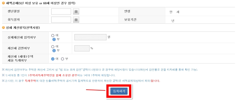 화면을 아래로 내려보면 나이나 주택 보유 기간에 따른 세액공제 정보를 입력하는 부분이 있어요. 만 60세 이상이거나 해당 주택을 5년 이상 보유한 경우 세금 감면 혜택을 받을 수 있으니, 해당된다면 생년월일과 취득일자를 빠짐없이 입력해 주세요. 모든 정보 기입을 마쳤다면 '등록하기'를 눌러줍니다.