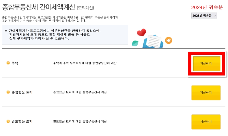 이제 간이세액계산 화면으로 이동했어요. 계산하고 싶은 귀속 년도를 확인한 뒤, 내가 가진 부동산 종류에 맞춰 선택하면 됩니다. 저는 '주택'을 기준으로 계산해 볼 것이기 때문에, 주택 항목 오른쪽에 있는 노란색 '계산하기' 부분을 눌러서 다음 단계로 진행해 보겠습니다.