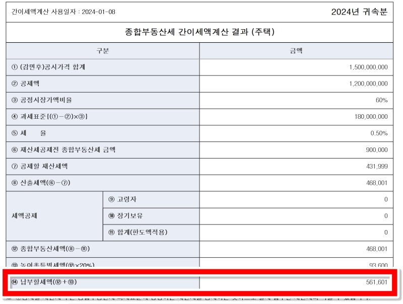 드디어 종합부동산세 간이계산 결과가 나왔습니다. 공시가격 합계부터 공제액, 과세표준, 세율 등 복잡한 계산 과정이 표로 일목요연하게 정리되어 있어요. 가장 아래에 있는 '납부할 세액 합계' 금액을 확인하면 내가 올해 내야 할 종합부동산세가 대략 얼마인지 예측할 수 있답니다.