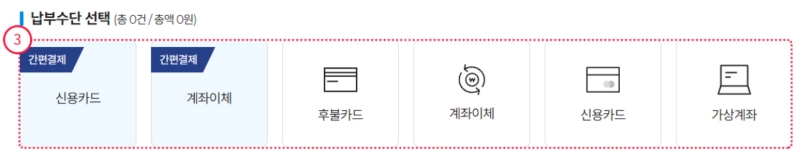 납부할 내역을 선택한 뒤에는 결제 수단을 고를 차례예요. 화면을 아래로 내리면 신용카드, 계좌이체, 후불카드 등 다양한 납부 수단이 아이콘으로 표시되어 있어요. 이 중에서 자신이 사용하기 편한 방법을 선택해서 결제를 진행하면 됩니다.