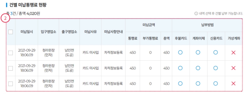 조회가 완료되면 이렇게 미납 통행료 현황이 목록으로 나타나요. 미납 일시, 입구와 출구 영업소, 미납 사유와 금액까지 상세하게 확인할 수 있었어요. 여기서 납부하고 싶은 내역 앞의 네모 칸을 선택해서 체크하면 됩니다. 저는 전체를 다 내기 위해 모두 선택했어요.