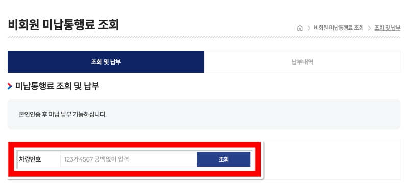 이제 비회원 미납 통행료를 조회하는 화면으로 이동했어요. 화면 중앙에 보이는 '차량번호' 입력란에 자신의 차량 번호를 공백 없이 입력한 뒤, 오른쪽에 있는 파란색 '조회' 부분을 눌러주세요. 본인인증 절차를 거치면 더 정확한 조회가 가능하다고 안내되어 있네요.