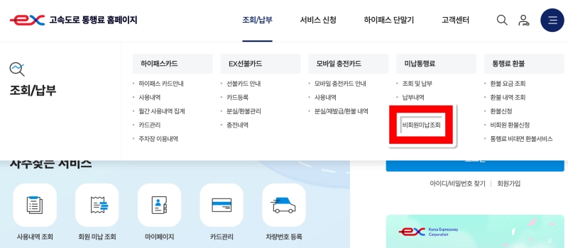 '조회/납부'를 선택하면 아래로 상세 메뉴가 펼쳐져요. 여러 가지 항목 중에서 로그인을 하지 않고도 바로 확인할 수 있는 '비회원 미납조회' 를 누르면 됩니다. 회원이라면 로그인 후 조회하는 것이 더 편리할 수도 있지만, 비회원 조회도 정말 간단해요.