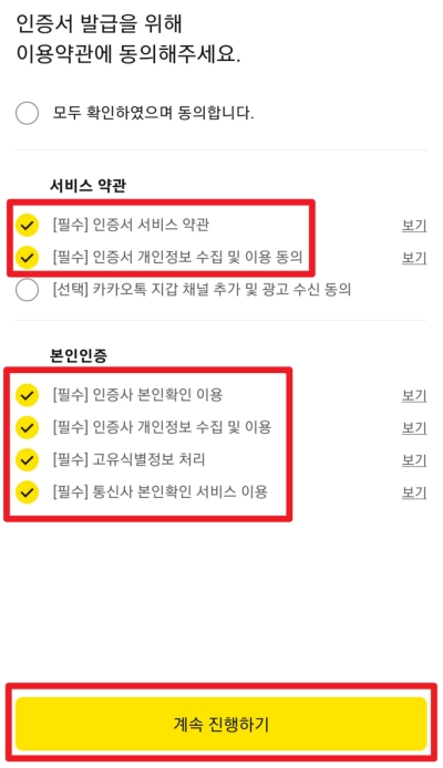 본격적인 발급에 앞서 약관 동의는 필수 과정이에요. 화면에 나타나는 여러 항목을 꼼꼼히 읽어보는 것이 좋지만, 바쁘시다면 [필수]라고 표시된 항목들만이라도 꼭 확인하고 체크해주세요. 서비스 이용과 개인정보 수집에 관한 내용들이니, 동의한 후에 '계속 진행하기'를 누르면 다음 단계로 넘어갈 수 있어요.