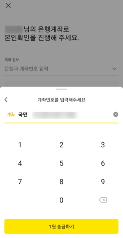 은행을 선택했다면 이제 계좌번호를 입력할 차례예요. 숫자 키패드를 이용해 본인의 계좌번호를 오타 없이 정확하게 입력해주세요. 다 입력한 뒤 아래에 있는 '1원 송금하기'를 누르면, 카카오에서 확인을 위해 해당 계좌로 1원을 보내줄 거예요. 이 1원에 중요한 정보가 담겨 있답니다.