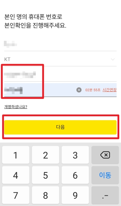 다음은 가장 기본적인 본인 확인 절차인 휴대폰 인증이에요. 본인 명의의 휴대폰 번호를 입력하면 인증번호가 문자로 발송되는데요. 문자로 받은 인증번호를 시간 안에 정확하게 입력한 뒤 '다음'을 눌러주세요. 이 과정은 내가 휴대폰의 실제 주인인지 확인하는 중요한 단계랍니다.