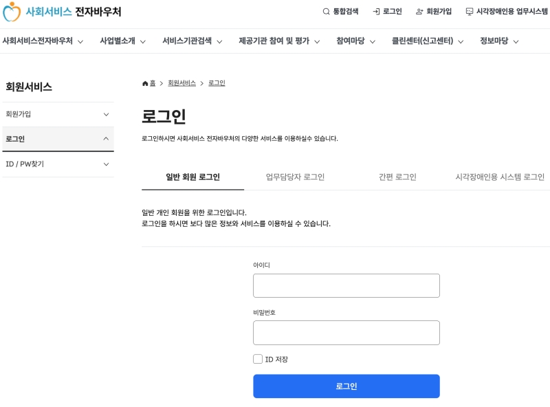 이제 사회서비스 전자바우처의 로그인 화면이 나타날 거예요. 이곳에서 미리 가입해 둔 아이디와 비밀번호를 입력하고 로그인하면, 마이페이지에서 현재 사용 중인 바우처의 잔액을 확인할 수 있어요. 웹사이트를 이용하는 방법은 이렇게 마무리돼요.