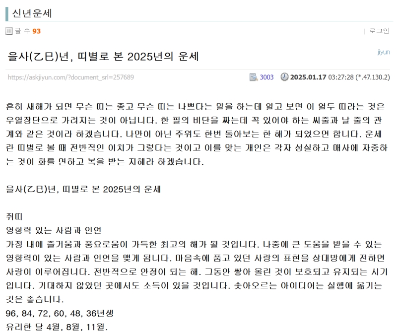 7. 신년운세 역시 띠별로 상세한 풀이를 제공해요. 예를 들어 2025년 을사년의 운세를 선택하면 쥐띠, 소띠 등 각 띠에 해당하는 한 해의 전반적인 흐름과 조심해야 할 점 등을 미리 알 수 있습니다.
