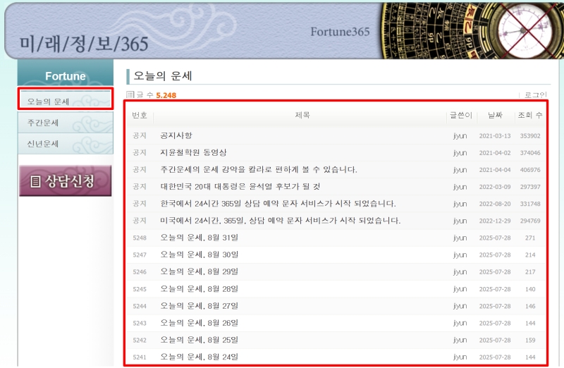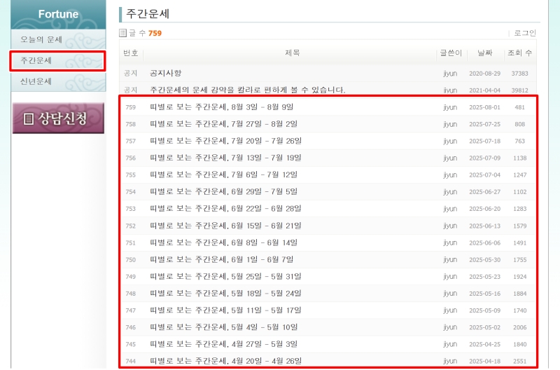 2. 페이지에 들어서면 왼쪽 메뉴에 오늘의 운세, 주간운세, 신년운세 항목이 보여요. '오늘의 운세'를 선택하면 날짜별로 정리된 운세 게시물 목록을 한눈에 확인할 수 있습니다.