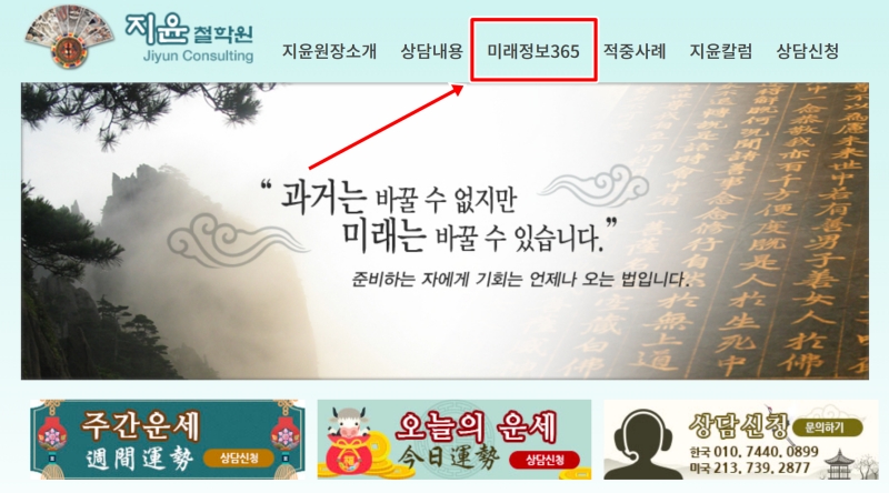 1. 홈페이지 상단 메뉴에서 '미래정보365'를 찾아 들어가면 다양한 운세 정보를 만날 수 있는 공간이 나타나요. 이곳에서부터 오늘과 내일, 그리고 더 먼 미래의 이야기를 엿볼 수 있습니다.