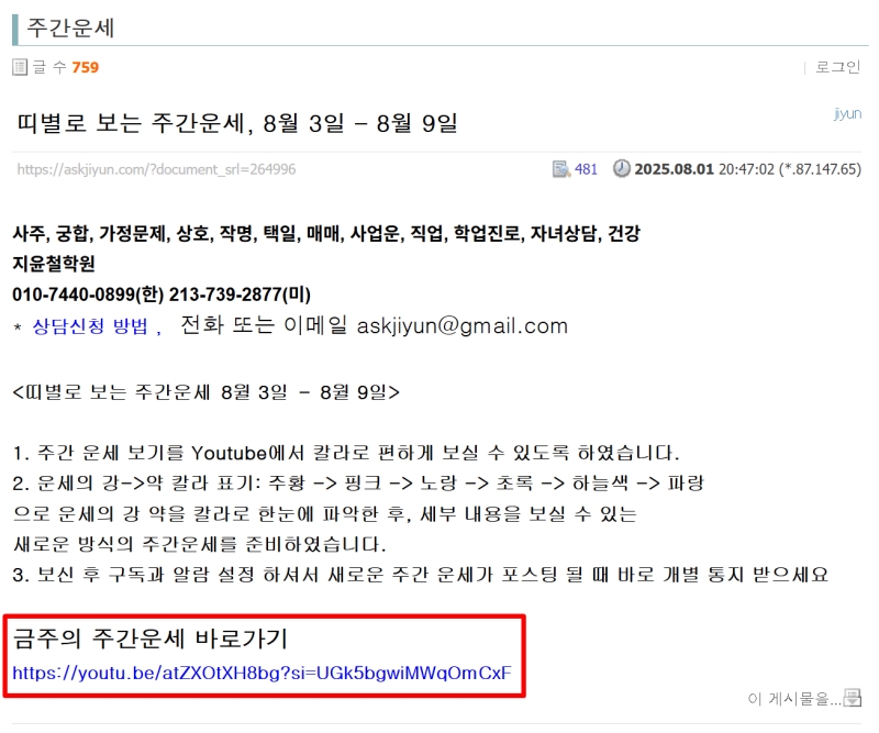5. 주간운세는 글로 읽는 것 외에도 영상으로 더욱 편하게 접할 수 있도록 바로가기를 마련해두었어요. 이를 통해 한 주의 운세를 색상으로 구분하여 한눈에 파악하는 새로운 방식을 경험할 수 있습니다.