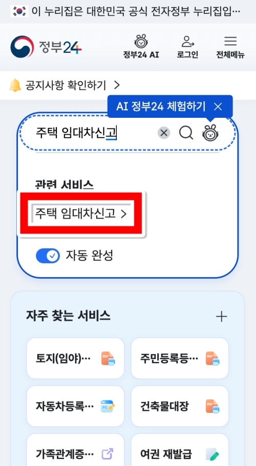 검색창에 '주택 임대차신고'라고 입력하면, 바로 아래에 '관련 서비스'라는 제목과 함께 우리가 찾던 메뉴가 나타나요. 다른 비슷한 이름의 서비스들도 있을 수 있으니 헷갈리지 마시고, 정확하게 '주택 임대차신고'라고 쓰여 있는 부분을 선택해서 다음으로 넘어가 주세요. 자동 완성 기능이 켜져 있으면 몇 글자만 입력해도 바로 나타나서 편하더라고요.