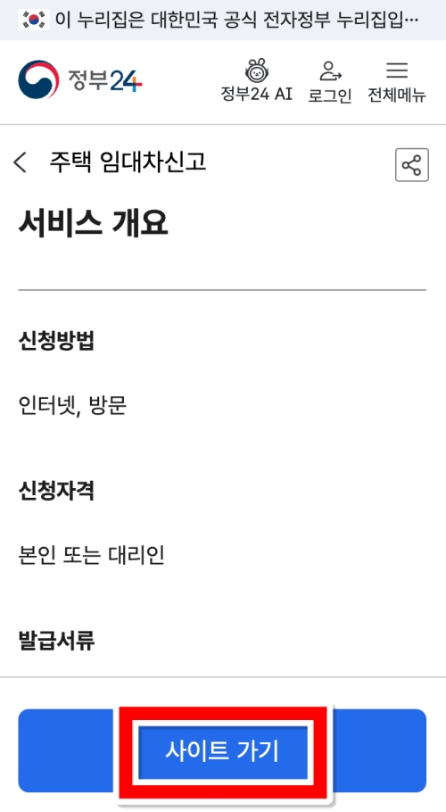 해당 서비스를 선택하면, 어떤 절차로 진행되는지, 누가 신청할 수 있는지 등 간단한 개요를 설명하는 화면이 나와요. 내용을 한번 가볍게 훑어보신 뒤, 실제로 신고를 진행하기 위해 화면을 맨 아래까지 내려 파란색 '사이트 가기'로 들어가시면 '부동산거래관리시스템'으로 이동합니다.