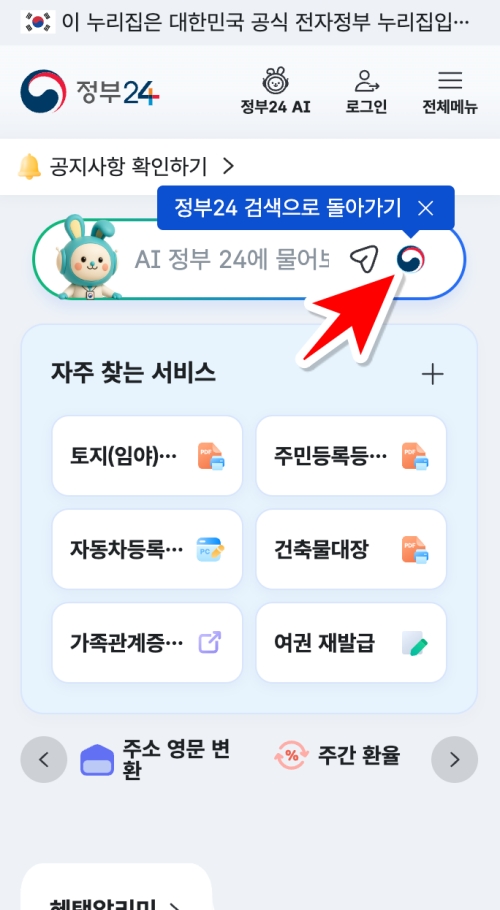 온라인으로 각종 민원 서류를 떼어보신 분들이라면 익숙하실 거예요. 먼저 '정부24'에 들어간 뒤, 화면 중앙에 검색창이 있어요. 검색으로 돌아가기라고 표시되어있는 부분을 선택하시면 원하는 민원을 검색할 수 있어요. 워낙 다양한 민원 서비스가 모여있는 곳이라, 여기서 우리가 하려는 '주택 임대차신고'를 직접 찾아 들어가는 방식으로 진행할 거예요.