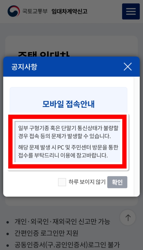 다음 화면으로 넘어가기 전에 안내창이 하나 나타날 거예요. 내용을 보면 스마트폰 기종이나 통신 상태에 따라 오류가 생길 수 있으니, 문제가 생기면 컴퓨터(PC)를 이용하거나 주민센터를 방문하라는 내용이에요. 모바일로도 충분히 가능하지만, 혹시라도 중간에 멈추거나 오류가 걱정된다면 처음부터 컴퓨터로 진행하는 것이 마음 편할 수 있다는 점을 알려주는 거죠.