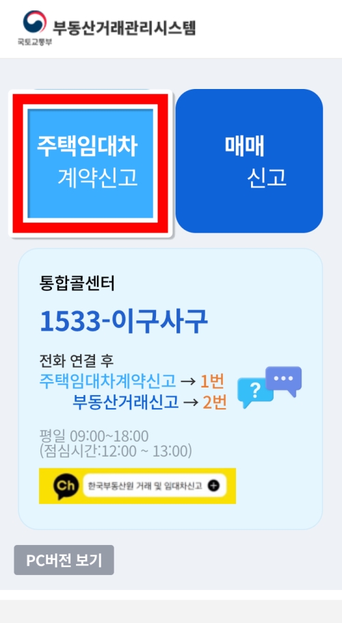 '부동산거래관리시스템'으로 이동하셨으면 화면에 '주택임대차 계약신고'와 '매매 신고'라는 두 개의 큰 네모 버튼이 보이는데, 우리는 전월세 계약을 신고할 것이므로 왼쪽에 있는 '주택임대차 계약신고'를 선택해야 해요. 오른쪽의 매매 신고는 집을 사고팔았을 때 쓰는 메뉴이니 헷갈리면 안 된답니다.
