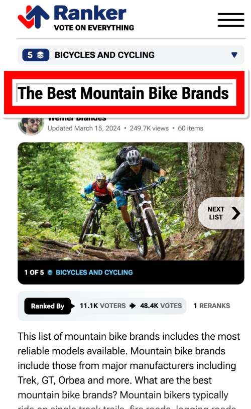 이번에 제가 참고한 순위는 해외의 유명 투표 사이트인 'Ranker'에서 진행한 '최고의 산악자전거 브랜드' 투표 결과예요. 전문가 한두 명의 의견이 아니라 무려 1만 명이 넘는 라이더들이 참여했고, 총 5만 번에 가까운 투표가 이루어져서 꽤 신뢰도가 높다고 할 수 있어요. 어떤 브랜드들이 라이더들의 마음을 사로잡았는지, 지금부터 1위부터 차례대로 함께 살펴볼게요.
