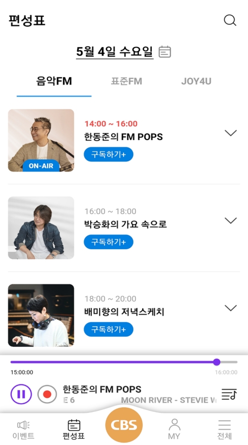 "내가 듣고 싶은 프로그램은 언제 하지?" 하고 궁금할 때가 있죠. 그럴 땐 화면 하단 메뉴에서 '편성표' 아이콘을 선택해 보세요. 이곳에서는 음악FM, 표준FM, JOY4U 각 채널별로 하루 전체의 방송 스케줄을 시간대별로 한눈에 확인할 수 있어요. 내가 좋아하는 프로그램의 방송 시간을 미리 확인해두면 놓치지 않고 챙겨 들을 수 있어서 정말 편리한 기능이에요.