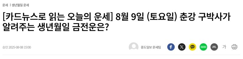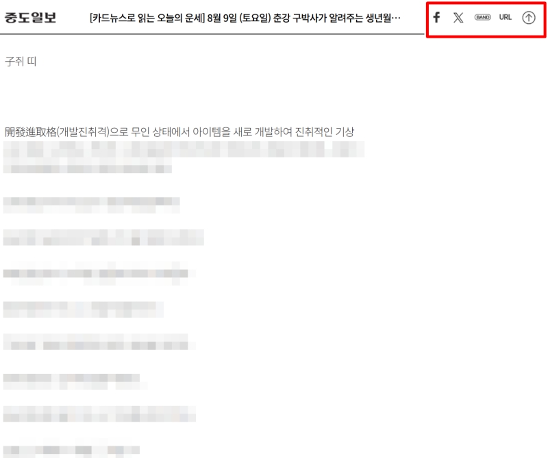 6. 오늘 확인한 운세 내용을 주변 사람들과 나누고 싶다면 기사 상단에 있는 공유 기능을 활용해 보세요. 페이스북, 밴드 등 다양한 경로를 통해 소중한 사람들에게 오늘 하루의 행운을 전달할 수 있습니다.