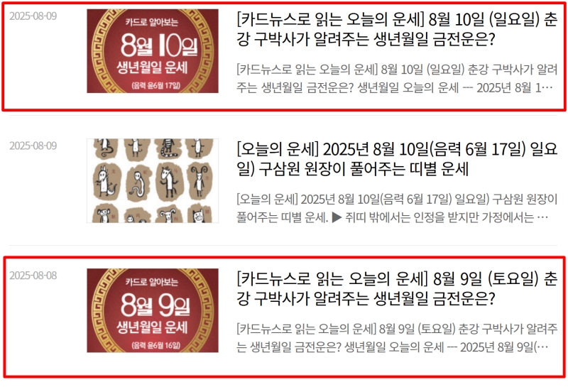 2. 운세 코너로 들어가면 날짜별로 정리된 운세 기사 목록이 나타나요. 띠별 운세, 생년월일 운세 등 다양한 형태의 운세가 있으니, 관심 있는 날짜의 기사를 선택하여 확인해 보세요.
