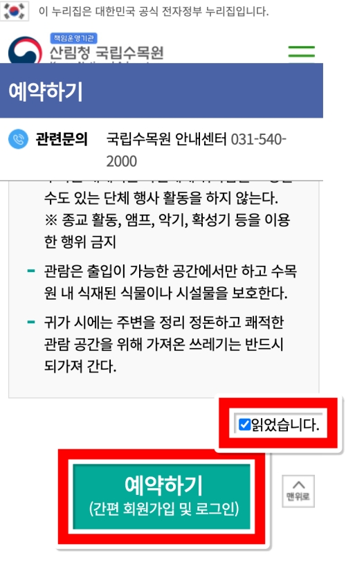 안내 사항을 모두 꼼꼼하게 읽어봤어요. 이제 화면을 끝까지 내려서 '읽었습니다'에 체크하고, 바로 아래에 있는 녹색 '예약하기' 버튼을 선택하면 본격적인 예약 절차가 시작됩니다. 간편 회원가입 및 로그인이 필요하다고 안내되어 있네요.