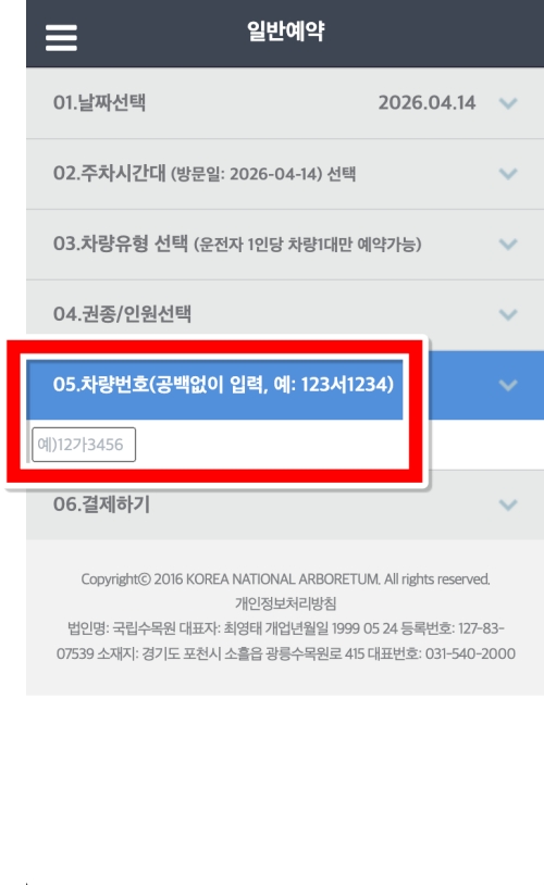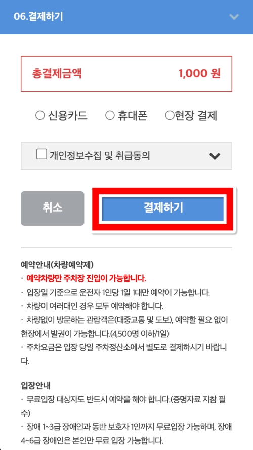 마지막 결제하기 순서입니다. 지금까지 선택한 인원수에 맞춰 계산된 총 결제금액을 확인하고, 신용카드나 휴대폰, 현장 결제 등 원하는 결제 수단을 선택하여 결제를 마치면 광릉수목원 예약이 완료됩니다.