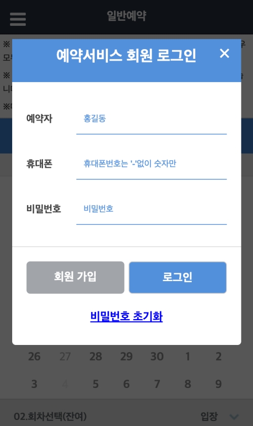 예약하기로 들어가면 회원 로그인을 위한 작은 창이 나타나요. 예약자 이름과 휴대폰 번호, 그리고 가입 시 설정했던 비밀번호를 입력하면 돼요. 만약 아직 회원이 아니라면, 이번 기회에 '회원 가입'을 통해 간단하게 가입을 진행한 뒤 로그인해주세요.