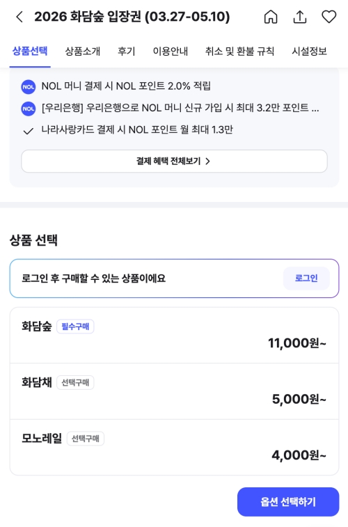 구매하기를 선택하면 티켓 판매를 위한 상세 페이지로 연결돼요. 이곳에서 현재 진행 중인 입장권의 이용 기간이나 다른 사람들의 후기 같은 유용한 정보를 확인할 수 있어요. 내용을 가볍게 훑어보신 후, 화면 아래쪽에 있는 '옵션 선택하기'로 들어가면 인원과 종류를 정할 수 있습니다.