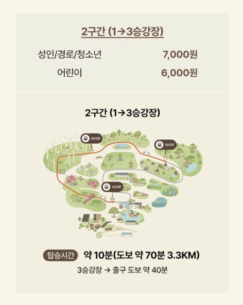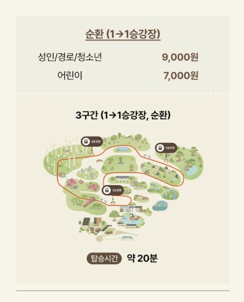 좀 더 긴 코스를 원한다면 2구간(1→3승강장)을 고려해 볼 수 있어요. 탑승 시간이 약 10분으로, 1구간보다 더 넓은 범위를 편안하게 둘러볼 수 있죠. 당연히 요금도 1구간보다는 조금 더 높게 책정되어 있으니, 이동 시간과 경로를 고려해서 선택하세요.