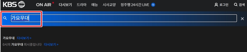 검색 아이콘을 선택하면 화면 상단에 검색창이 길게 나타나요. 여기에 우리가 찾으려는 프로그램 이름인 '가요무대'라고 입력해 주세요. 전부 다 입력하지 않아도 아래에 연관 검색어로 '가요무대 다시보기'가 떠서 더 쉽게 접근할 수 있더라고요.