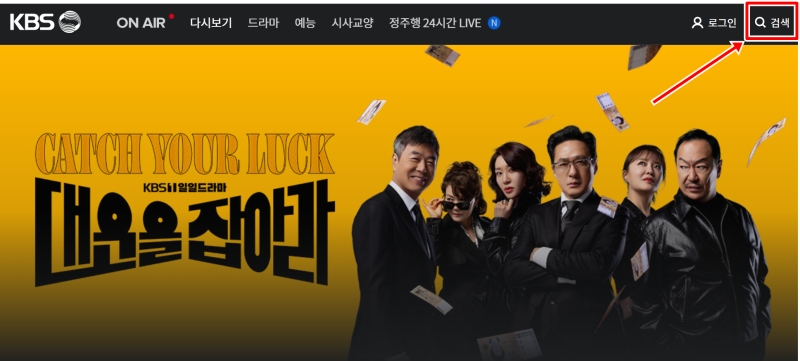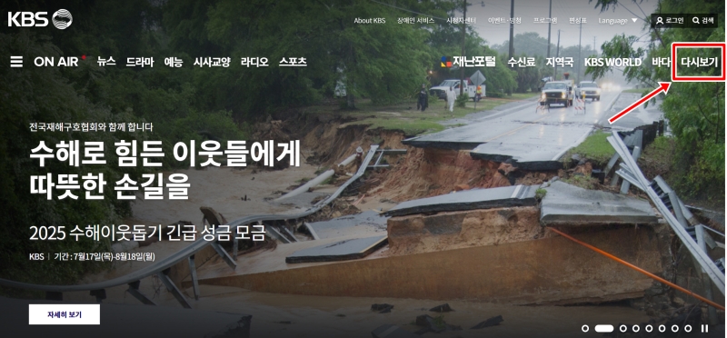 우선 인터넷을 통해 KBS 공식 홈페이지에 들어가 주세요. 사이트에 처음 들어가면 뉴스나 현재 방영 중인 드라마 소식이 먼저 보이는데요. 우리는 지난 방송을 찾아야 하니, 화면 오른쪽 위에 있는 여러 메뉴 중에서 '다시보기'를 선택해서 들어가는 게 가장 빨라요.