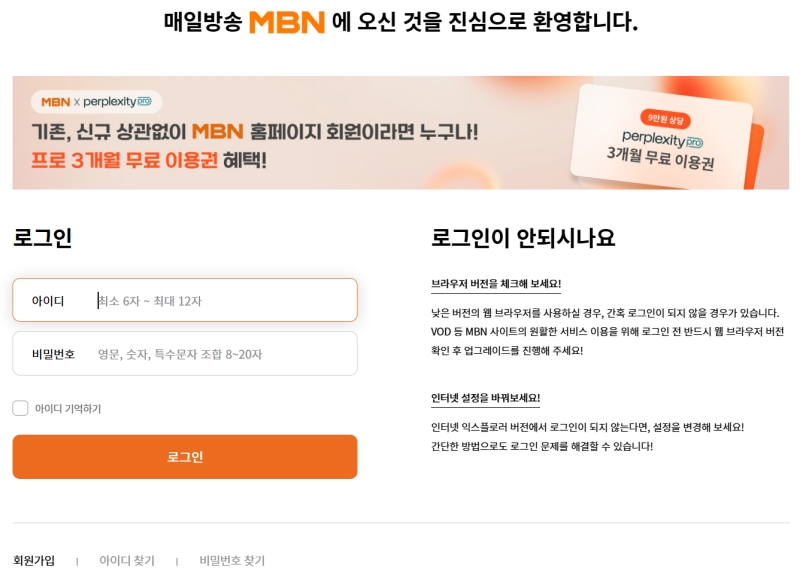 구매를 진행하려면 MBN 계정으로 로그인을 해야 합니다. 아이디가 없다면 먼저 회원가입을 해야 하고, 아이디가 있다면 아이디와 비밀번호를 입력해 로그인해주세요. 로그인 후 결제 절차를 마치면 바로 '특종세상' 다시보기를 시청할 수 있습니다.