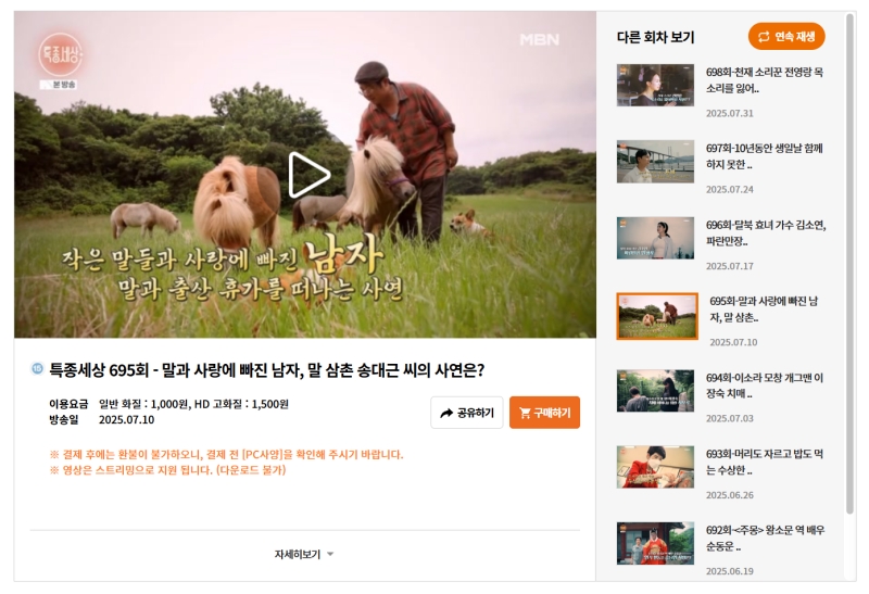 보고 싶은 회차를 찾았다면 해당 썸네일을 선택해서 재생 페이지로 들어갑니다. 여기서 중요한 점은 방송을 보려면 '이용요금'을 결제해야 한다는 안내 문구입니다. 유료 서비스이므로, 시청을 원하신다면 '구매하기' 버튼을 선택해 다음 절차를 진행해야 합니다.