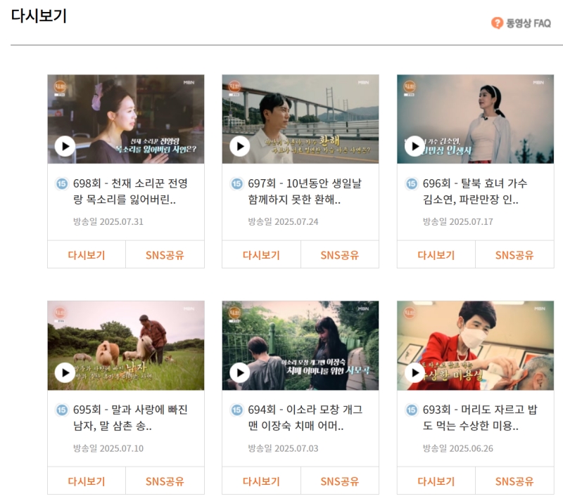 다시보기 페이지로 들어오면, 최근 방송부터 과거 방송까지 모든 회차의 목록이 썸네일과 함께 정리되어 있습니다. 스크롤을 내리면서 내가 보고 싶었던 회차의 제목이나 방송 날짜를 확인하고 찾아보세요.