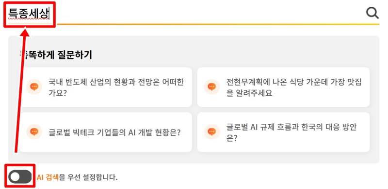 'AI 검색'을 선택하면 검색어를 입력할 수 있는 창이 나타납니다. 여기에 우리가 찾고 있는 프로그램 이름인 '특종세상'을 입력해 주세요. 보통 프로그램 이름을 정확히 입력하면 바로 관련 결과가 나타나서 편리합니다.