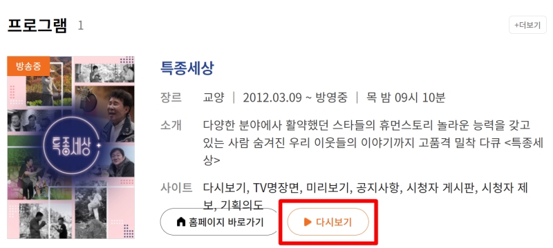 검색 결과 화면에서 '특종세상' 프로그램 정보를 확인하셨다면, 설명 아래에 있는 주황색 '다시보기' 버튼을 선택해 주세요. 이 버튼을 통해 지금까지 방영된 모든 회차의 목록을 볼 수 있는 페이지로 바로 이동하게 됩니다.