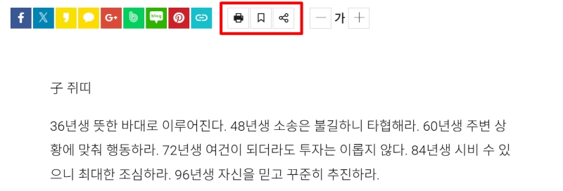 3. 기사 본문에서는 쥐띠부터 돼지띠까지 각 띠에 해당하는 오늘의 운세와 조언을 자세히 읽어볼 수 있어요. 또한 상단의 아이콘들을 통해 인쇄하거나 다른 사람에게 공유하는 등 다양하게 활용할 수 있습니다.