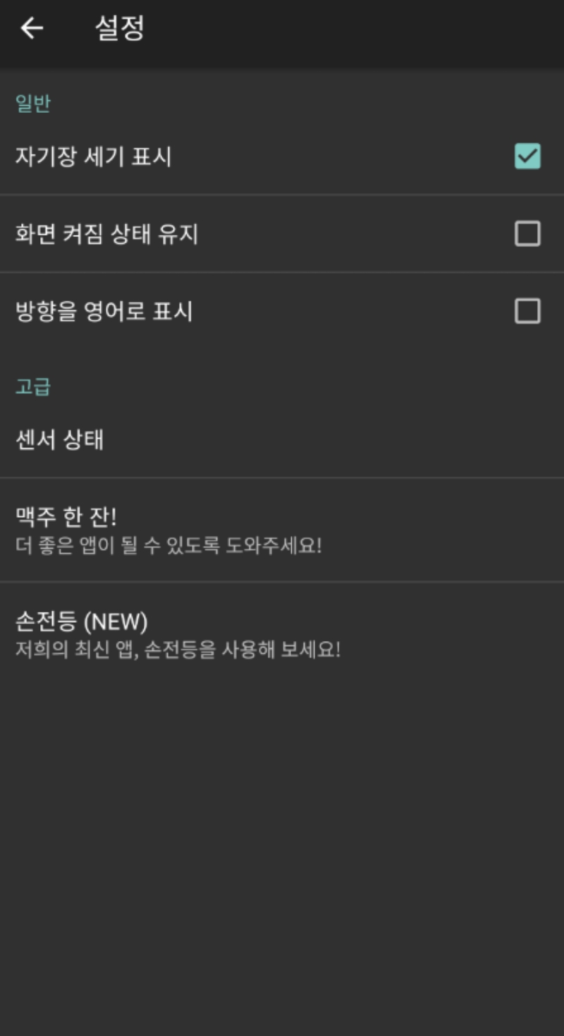 6. 설정 메뉴에서는 자기장 세기 표시나 화면 꺼짐 방지 등 개인의 필요에 맞게 여러 가지를 조절할 수 있어요. 방향을 영어로 표시하는 것과 같은 세심한 부분까지 설정할 수 있어 더욱 편리합니다.