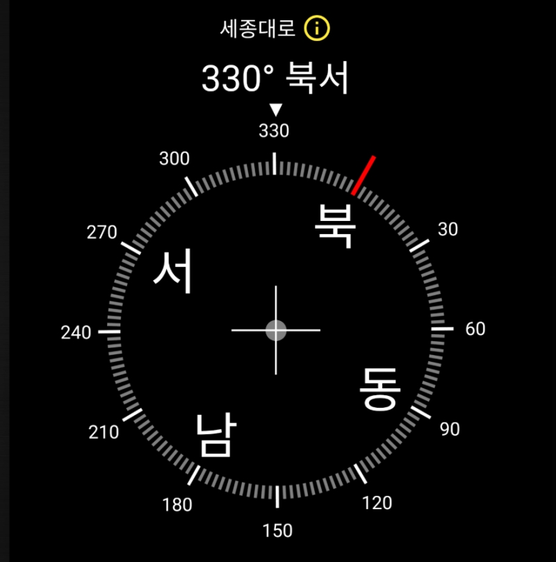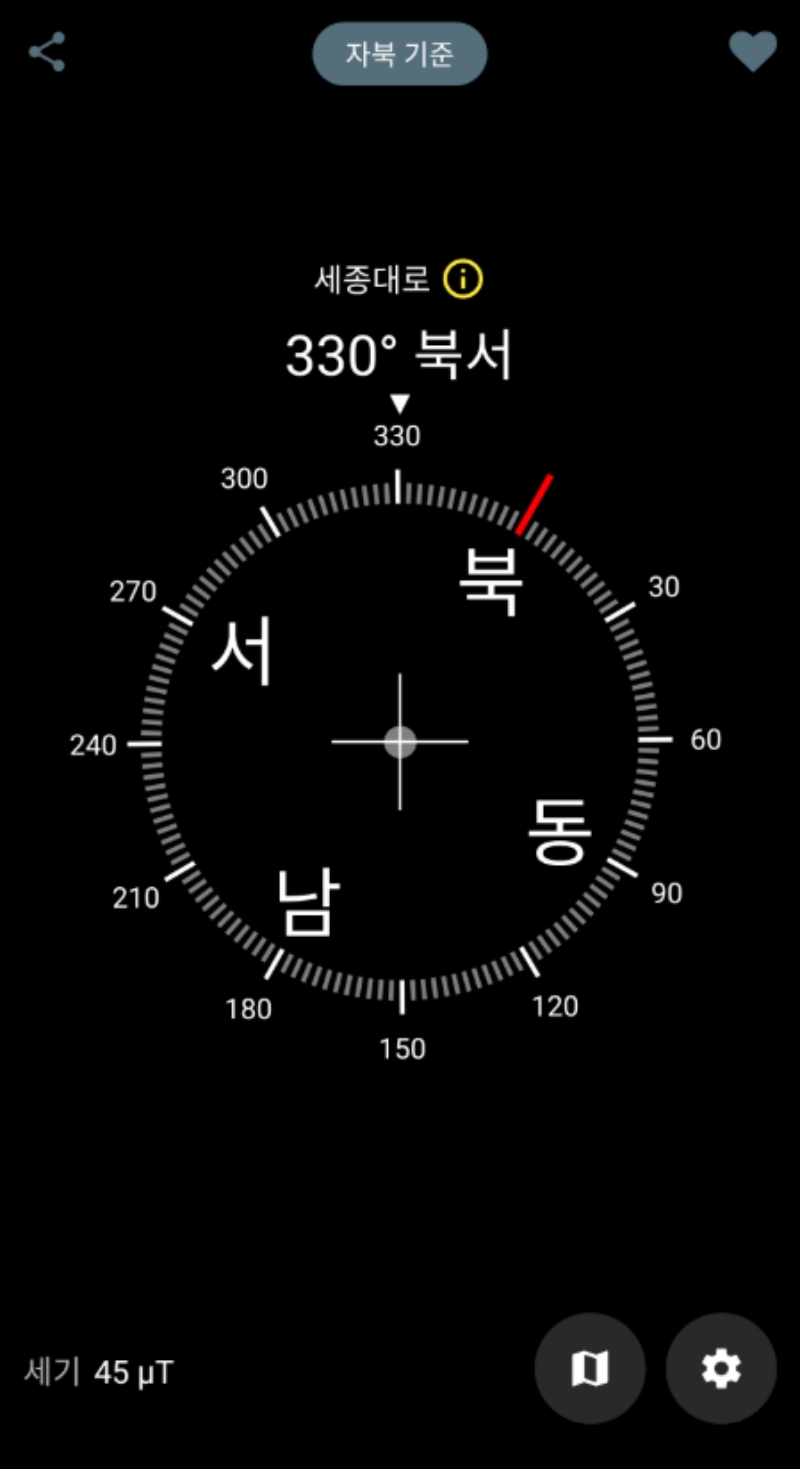 2. 프로그램을 실행하면 군더더기 없이 깔끔한 화면에 동서남북이 표시된 나침반이 바로 나타나요. 붉은색 바늘이 현재 내가 향하고 있는 방향을 정확하게 가리켜주어 직관적으로 방향을 파악할 수 있습니다.