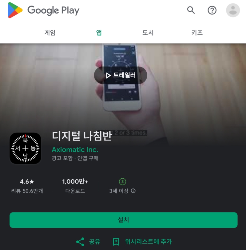 1. 스마트폰의 앱 장터에 들어가면 '디지털 나침반'과 같은 다양한 프로그램을 찾아볼 수 있어요. 수많은 사람들의 평가와 사용 후기를 참고하여 내 마음에 드는 것을 고른 후, '설치'를 눌러주면 모든 준비가 끝납니다.