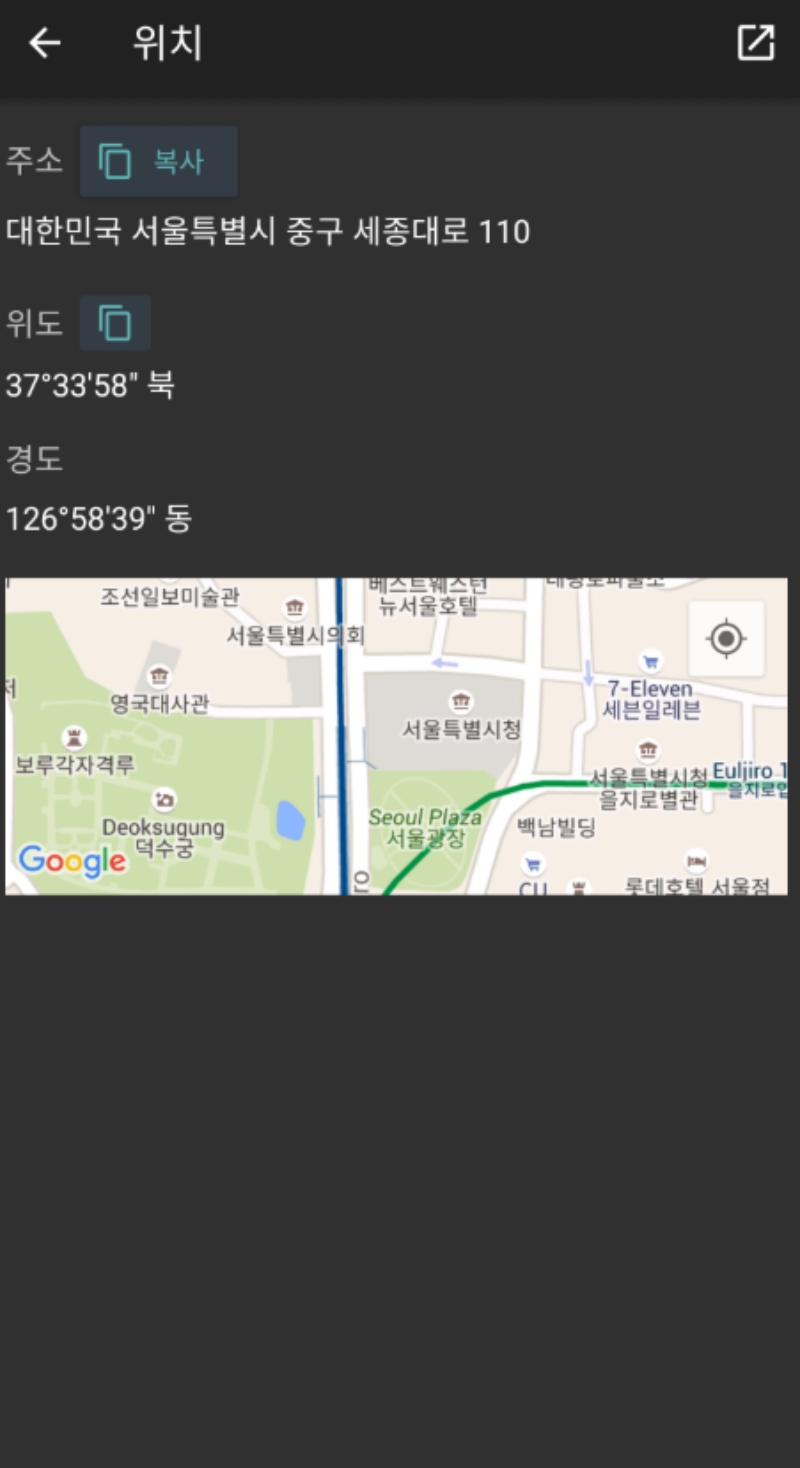 4. 지도 모양 아이콘을 선택하면 현재 내가 있는 곳의 정확한 주소와 함께 위도, 경도 정보까지 상세하게 확인할 수 있어요. 내 위치를 다른 사람에게 알려주어야 할 때 아주 유용하게 사용할 수 있습니다.