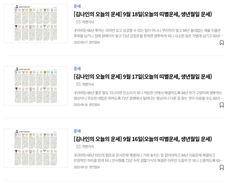3. 운세 코너에 들어서면 '김나인의 오늘의 운세'라는 제목으로 날짜별 운세가 순서대로 정리된 목록을 볼 수 있어요. 이곳에서 가장 최신 날짜의 운세를 선택하여 오늘 하루의 기운을 확인하면 됩니다.